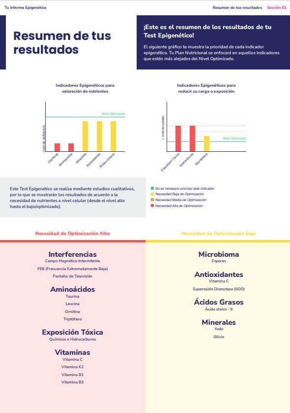 Si buscas mejorar tu salud global y fortalecer tu sistema inmunológico, este informe epigenético de salud es la herramienta que necesitas. A través del análisis de tu bioinformación celular, descubrirás cómo tu cuerpo procesa los nutrientes y qué factores influyen en tu bienestar físico y emocional.