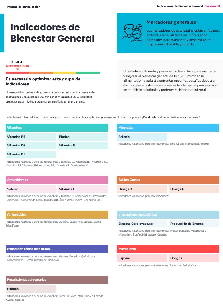 El informe epigenético infantil está diseñado para optimizar el bienestar y la energía de los niños, reforzar su sistema inmune, cardiovascular e intestinal y apoyar los indicadores clave de crecimiento y desarrollo físico y cognitivo.