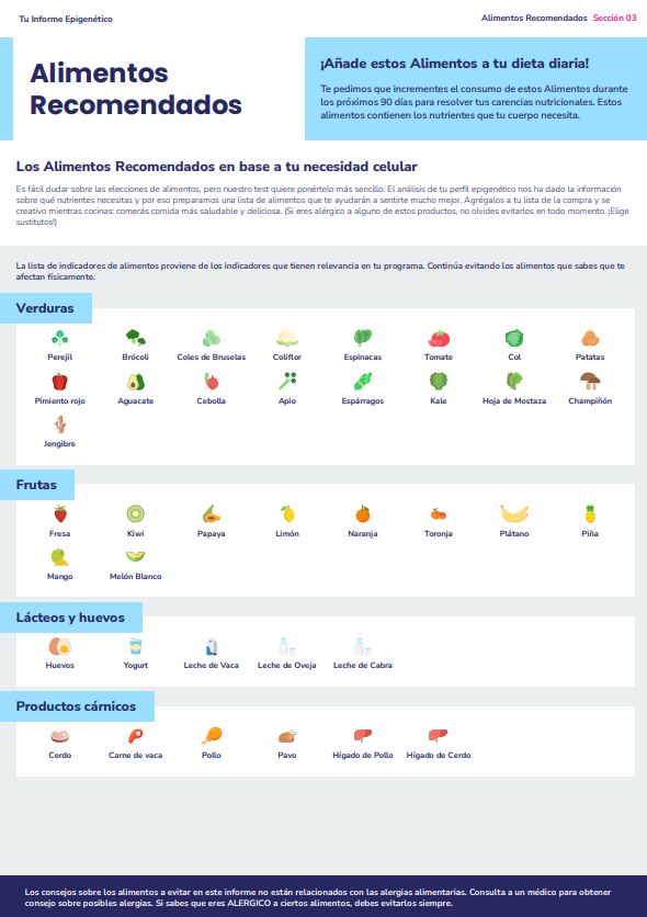 • Recomendaciones nutricionales personalizadas, con los alimentos que tu cuerpo necesita y los que debes evitar.